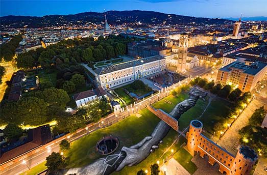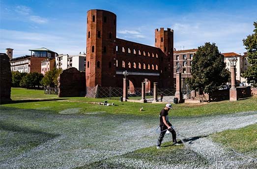 In der bezaubernden Kulisse des Archäologischen Parks an der Turiner Porta Palatina erweckte Saype ein Kunstwerk zum Leben, das sich auf über 6.000 Quadratmetern erstreckt. Dieses riesige Gemälde ist ein Symbol für Solidarität, Widerstandsfähigkeit und Respekt für die Umwelt, das die Stadt Turin im übertragenen Sinne mit dem Rest der Welt verbindet.