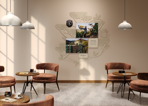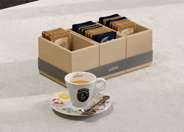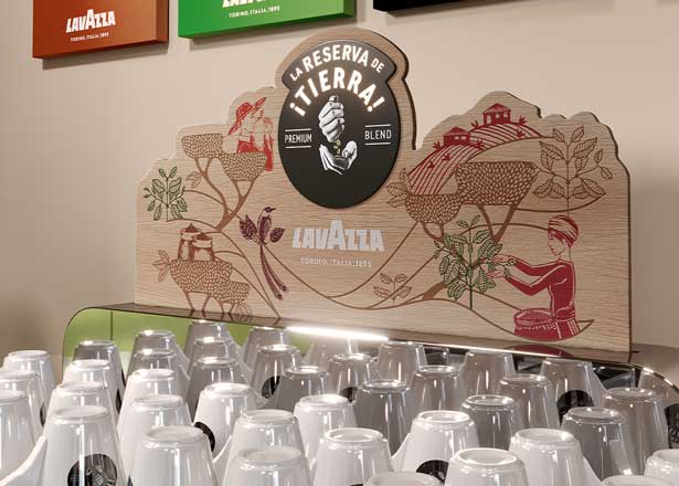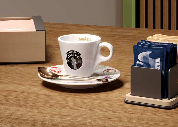 Unsere Ausstattung, Kommunikation und Farben stehen exklusiv für Lavazza und übermitteln unser Engagement für Nachhaltigkeit.