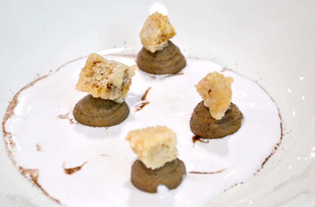 Wichtig für das Rezept ist der flüssige Kaffee in der Mitte, der durch Ferran Adriàs‘ umgekehrte Sphärisierung entsteht. Die Grundlage ist ein salziges Kaffee-Crumble, in dem die Kaffeekugel von weißer Schokolade und Kaffeecreme umhüllt wird. Beim Schneiden entdeckt man die überraschende Konsistenz und Genussfreude.